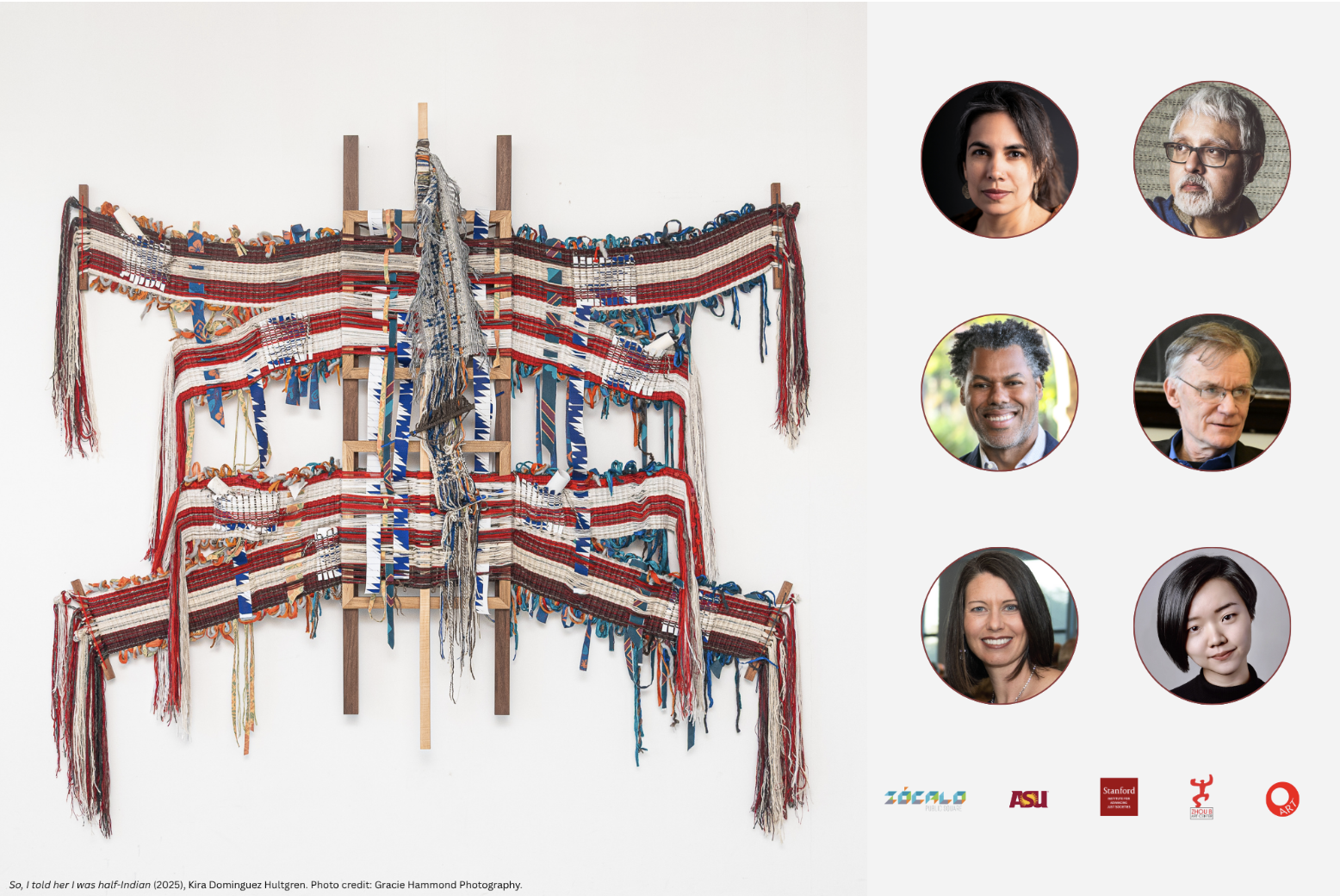 This program is inspired by So, I told her I was half-Indian (2025) by Chicanx and Punjabi American weaver Kira Dominguez Hultgren. The piece, multiple looms woven together as a suspended sculpture, is commissioned by IAJS and will be on view at Zhou B Art Center from August 12 to September 12, 2025.