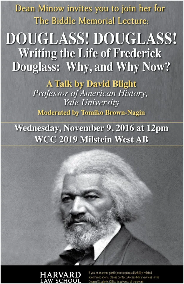 David Blight gave the Biddle Memorial Lecture at Harvard Law School on November 9, 2016. His lecture, “DOUGLASS! DOUGLASS! Writing the Life of Frederick Douglass: Why, and Why Now?” was moderated by Tomiko Brown-Nagin, Daniel P.S. Paul Professor of Constitutional Law at Harvard Law School.